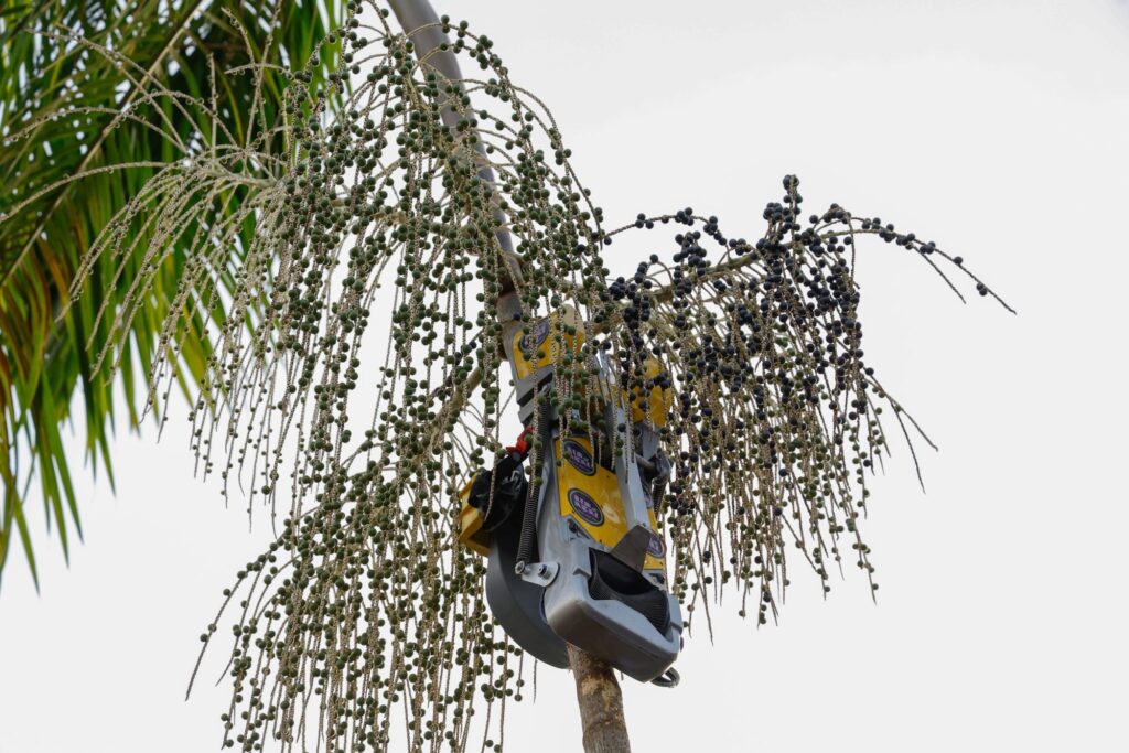 Compacto e de fácil manuseio, o açaí bot pesa apenas 8 quilos, é operado por controle remoto e pode colher cachos de até 14 quilos