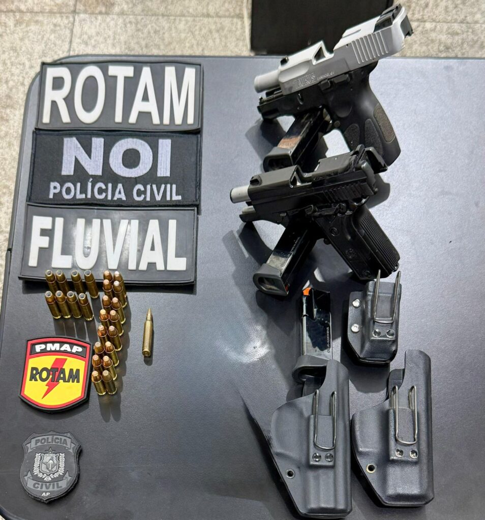 No momento da abordagem foram encontradas duas armas de fogo no veículo, uma delas com numeração raspada e outra de uso pessoal