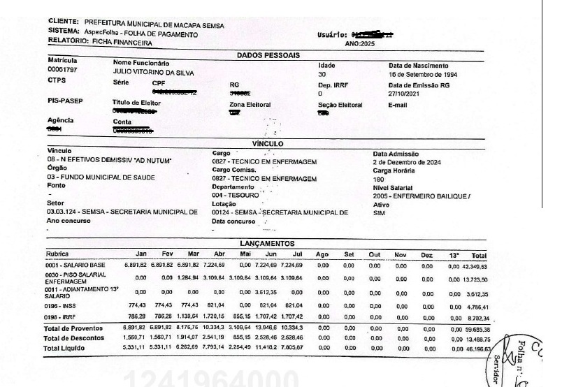 Júlio Vitorino seria estudante do curso técnico de enfermagem, mas estaria exercendo função de técnico junto à Prefeitura