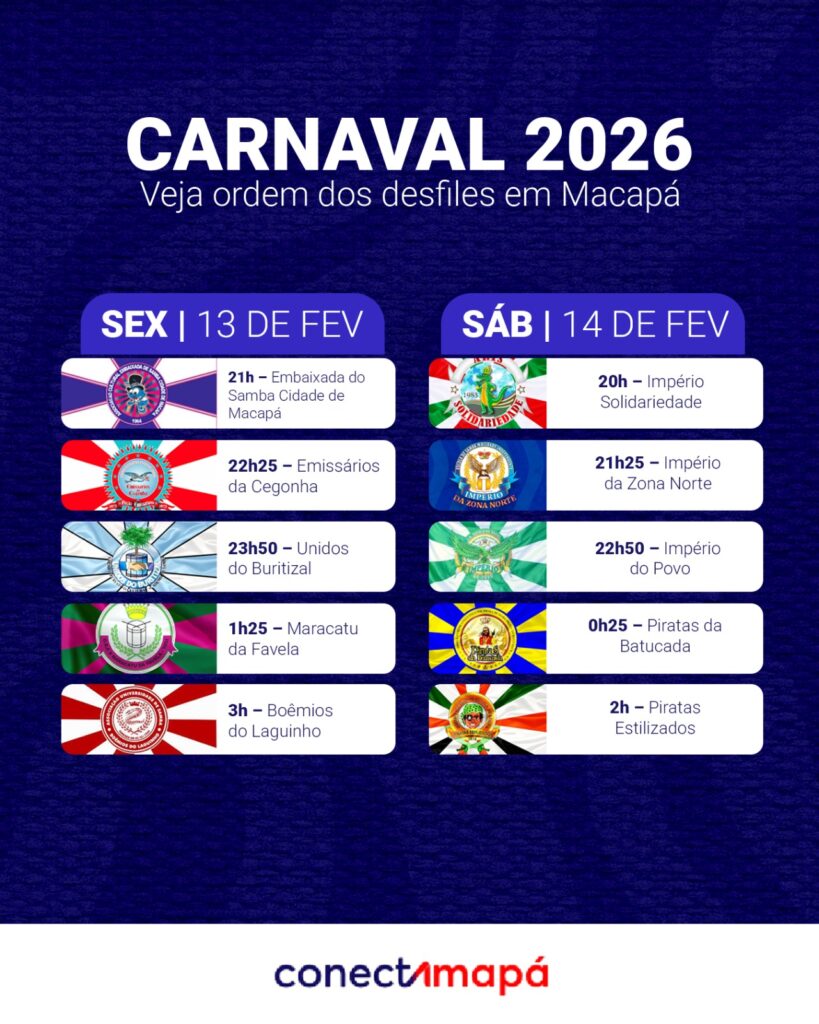 A ordem oficial de apresentação das escolas de samba no Carnaval amapaense de 2026 já está definida. Os desfiles acontecem nos dias 13 (sexta-feira) e 14 (sábado) de fevereiro, no Sambódromo Ivaldo Veras, em Macapá, com dez agremiações na avenida.