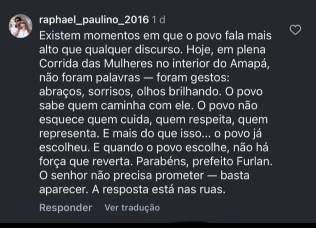 “O povo não esquece quem cuida, quem respeita, quem representa. E mais do que isso… o povo já escolheu. E quando o povo escolhe não há força que reverta. Parabéns, prefeito Furlan. O senhor não precisa prometer – basta aparecer. A resposta está nas ruas.”