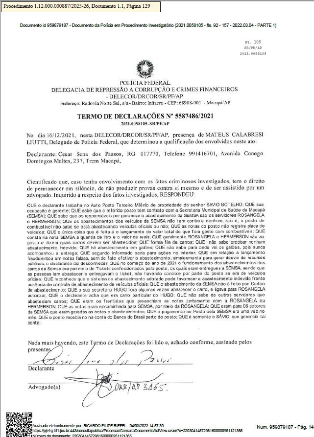 Em depoimento ao delegado da PF, Mateus Calabresi, responsável pelo inquérito, Cézar Sena dos Passos, gerente do Posto de Combustível Terceiro Milênio, afirmou que os abastecimentos realizados pela SEMSA eram feitos sem qualquer critério técnico ou administrativo.