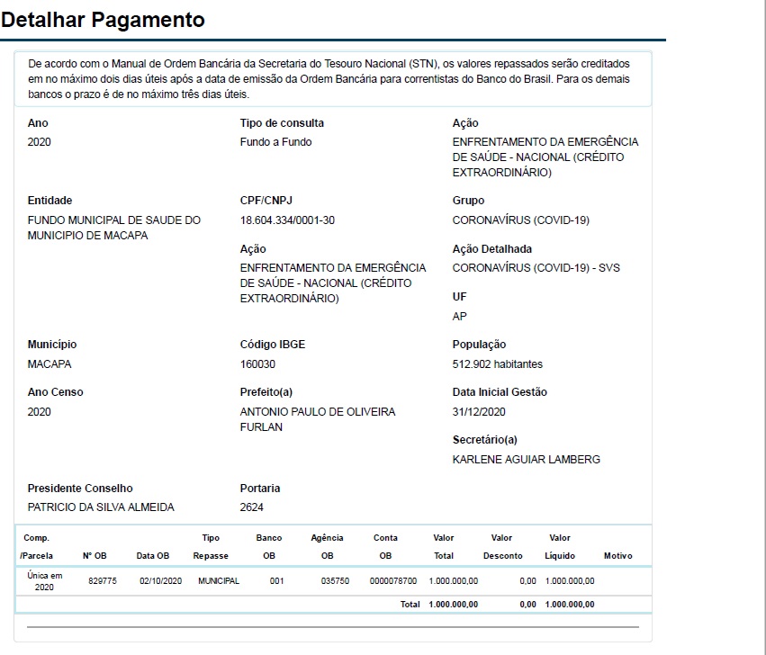 Um extrato da Secretaria do Tesouro Nacional (STN) confirma que o Fundo Municipal de Saúde de Macapá recebeu R$ 1 milhão para o enfrentamento da pandemia.