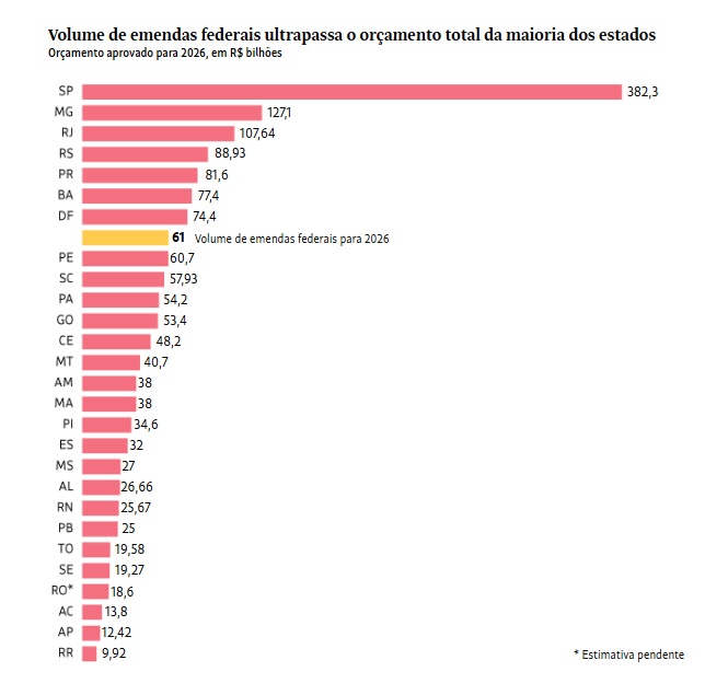 O dinheiro das ememdas supera ainda o orçamento de outras unidades da federação como Pernambuco, que tem despesas previstas de R$ 60,7 bilhões para 2026. A população do estado é de 9 milhões de habitantes.