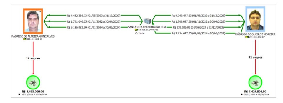Além dos dois saques de maior impacto, a investigação identificou uma série de operações semelhantes. Foram contabilizados, no período entre janeiro de 2023 e setembro de 2024 quarenta e dois saques realizados por RODRIGO DE QUEIROZ MOREIRA, somando mais de R$ 7,4 milhões e 17 saques por FABRIZIO DE ALMEIDA GONÇALVES, totalizando cerca de R$ 2,4 milhões. Trata-se de movimentações frequentes, fracionadas e em dinheiro vivo .