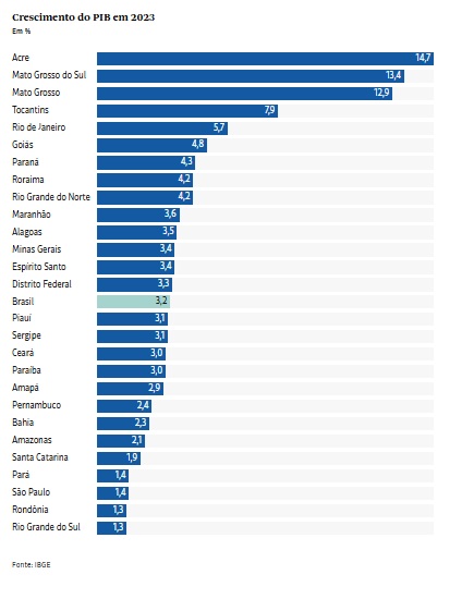 Já as menores variações foram encontradas no Rio Grande do Sul (1,3%), em Rondônia (1,3%), no Pará(1,4%) e em São Paulo (1,4%). O PIB do Brasil avançou 3,2% em 2023.