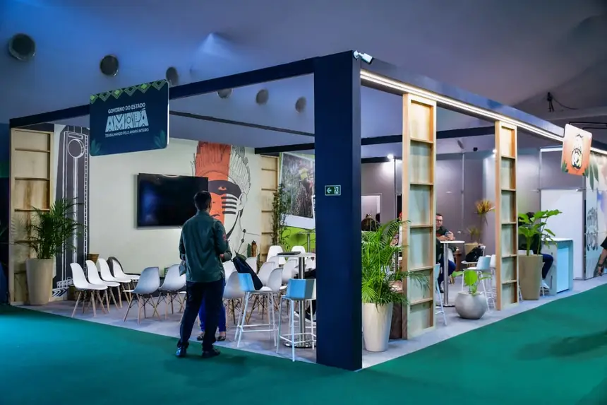 O estande do Amapá na 30ª Conferência das Nações Unidas sobre as Mudanças Climáticas (COP30), a COP da Amazônia (COP30), que inicia nesta segunda-feira, 10, chega como um espaço de referência em ciência, inovação e cultura, do estado mais preservado do Brasil e que mais realizou eventos preparatórios para o maior evento global sobre clima.