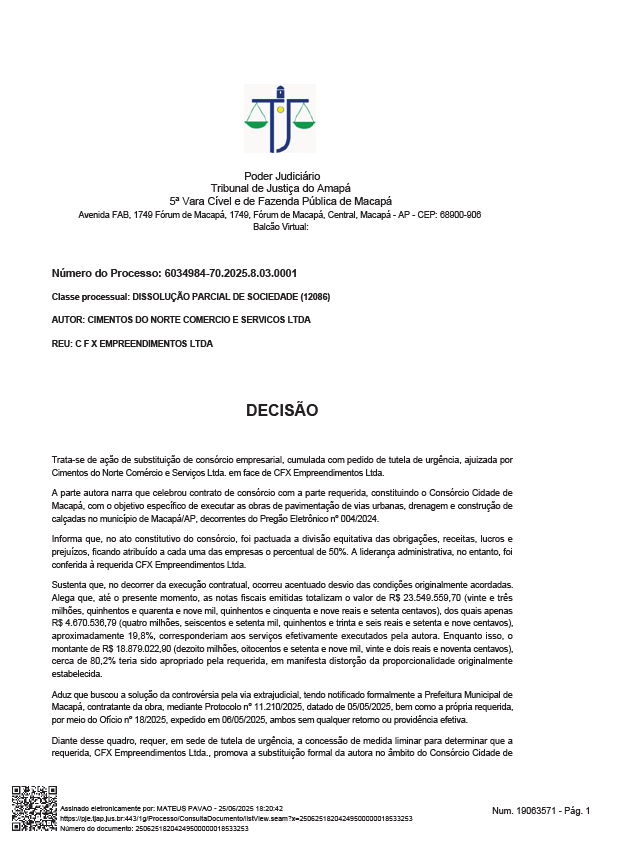 Sem retorno por parte da CFX nem da Prefeitura de Macapá, mesmo após notificações formais enviadas em maio deste ano, a Cimentos do Norte recorreu ao Judiciário pedindo, em caráter liminar, a exclusão do consórcio e sua substituição formal nos cadastros e contratos da obra. Em caso de recusa, a empresa solicita a dissolução total do consórcio.
