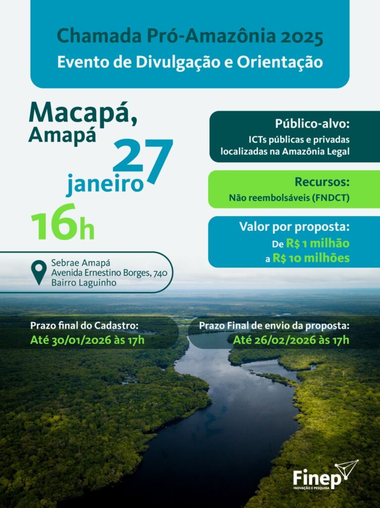 A Finep realiza um encontro presencial aberto ao público nesta terça-feira (27/01), às 16h, no Sebrae de Macapá/AP, para orientar as Instituições Cientificas e Tecnológicas (ICTs), públicas e privadas, sobre a chamada “Infraestrutura para a Amazônia Legal — Pró-Amazônia 2025”. A chamada visa selecionar propostas para o apoio financeiro ao desenvolvimento de infraestrutura de pesquisa científica e tecnológica na região.