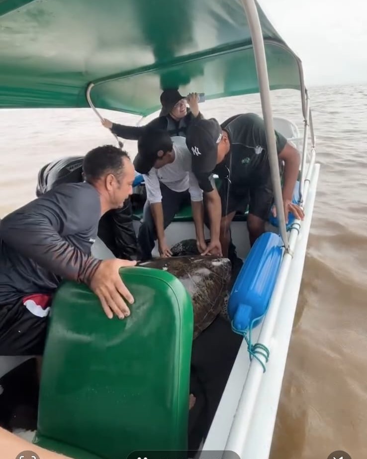O resgate contou com o apoio do Cetas do Ibama no Amapá. A tartaruga, uma fêmea com 96 centímetros de casco, recebeu atendimento veterinário especializado, com o suporte da equipe do Projeto de Caracterização e Monitoramento de Cetáceos (PCMC), uma condicionante do licenciamento ambiental conduzido pelo Ibama na margem equatorial brasileira.