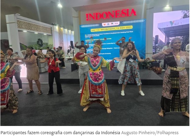 O governo deu uma guaribada na cidade. O Parque recebe a COP30. Tráfego intenso. Babel. Passam africanos com turbantes e longas batas, passam dançarinos de carimbó que saíram de um show. Há filas nos espaços dos países para ganhar brindes.