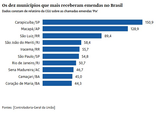 Macapá foi o segundo município a receber o maior volume de verbas públicas através das “Emendas Pixs”. A prefeitura de Macapá recebeu R$128,9 milhões, logo atrás de Carapicuíba, município de São Paulo, que recebeu R$ 150,9 milhões e bem a frente do terceiro município “agraciado” com as emendas. São Luiz, município de Roraima, recebeu R$ 89,4 milhões.