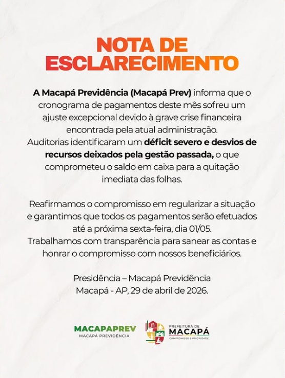 A Macapá Previdência (MacapáPrev) divulgou nota oficial nesta terça-feira (29) admitindo um cenário financeiro crítico que levou ao ajuste no cronograma de pagamentos de aposentados e pensionistas do município. Segundo o órgão, a situação é resultado de irregularidades e desvios de recursos da gestão anterior, o que comprometeu diretamente o fluxo de caixa da instituição.