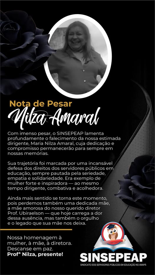 A informação foi confirmada em nota distribuída pelo Sinsepeap. Na nota a entidade sindical afirma que ‘a história de Nilza Amaral é a prova de que a vida ganha sentido quando se dedica a servir ao próximo. Sua trajetória foi marcada pela incansável defesa dos trabalhadores e trabalhadoras, sempre com coragem, firmeza e um coração repleto de empatia”.