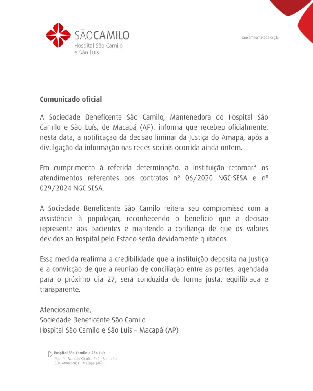 O hospital informa que foi notificado da decisão judicial que determina a retomada do atendimento e que “em cumprimento à referida determinação, a instituição retomará os atendimentos referentes aos contratos 06/2020 NGC-SESA e 029/2024 NGC-SESA”.