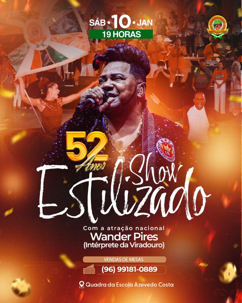 Piratas Estilizados completa 52 anos, neste dia 5 de janeiro, e traz o intérprete da Viradouro, Wander Pires, para a celebração no próximo sábado (10), na Quadra da Escola Azevedo Costa, com participação das co-irmãs, no encontro das bandeiras, e dos pontos técnicos da agremiação do bairro do Laguinho. O intérprete oficial, Catatau, e os integrantes da ala musical – Tom Laranja, e da melhor bateria do Estado, Orquestra de Bambas, prepararam um repertório com muito samba e resgate de sambas-enredo que marcaram os desfiles da Mais Querida do carnaval amapaense.