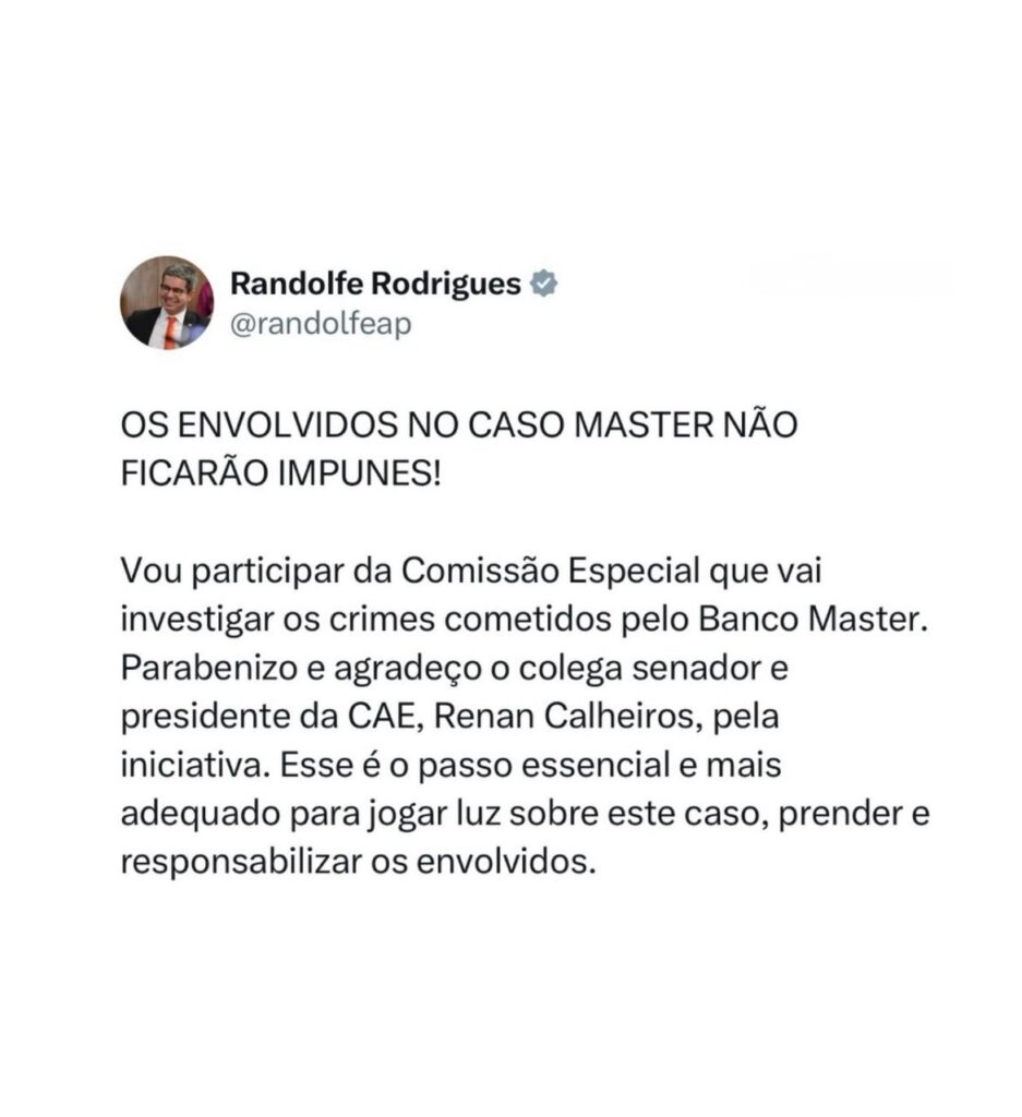 ‘Vou participar da Comissão Especial que vai investigar os crimes cometidos pelo Banco Mster. Parabenizo e agradeço ao colega senador presidente da CAR, Renan Calheiros, pela iniciativa. Esse é o passo essencial e mais adequado para jogar luz sobre esse caso, preder e responsabilizar os envolvidos”, publicou Randolde no Instagran.
