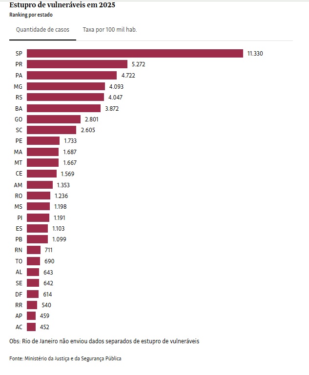 Segundo dados do Ministério da Justiça e Segurança Pública, em números absolutos o estado de São Paulo liderou o número de resgistros de casos de estupro de vulneráveis, em todo o país, em 2025. São Paulo registrou 11.330 casos , seguido por Paraná (5.272), Pará (4.722), Minas Gerais (4.093) e Rio Grande do Sul (4.047).