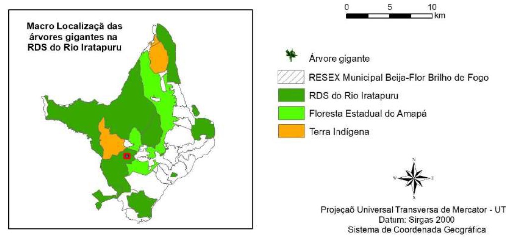 Sete árvores foram espacializadas pelo setor de geoprocessamento da SEMA, com alturas superiores a 80 metros. Estão distribuídas entre a Reserva de Desenvolvimento Sustentável do Rio Iratapuru, a Floresta Nacional do Amapá, e áreas de assentamento na região de Maracá-Camaipi. Algumas dessas árvores estão próximas a áreas de garimpo e concessões florestais, aumentando o risco de degradação ambiental. Uma das arvores está a apenas 900 metros de uma área de garimpo.
