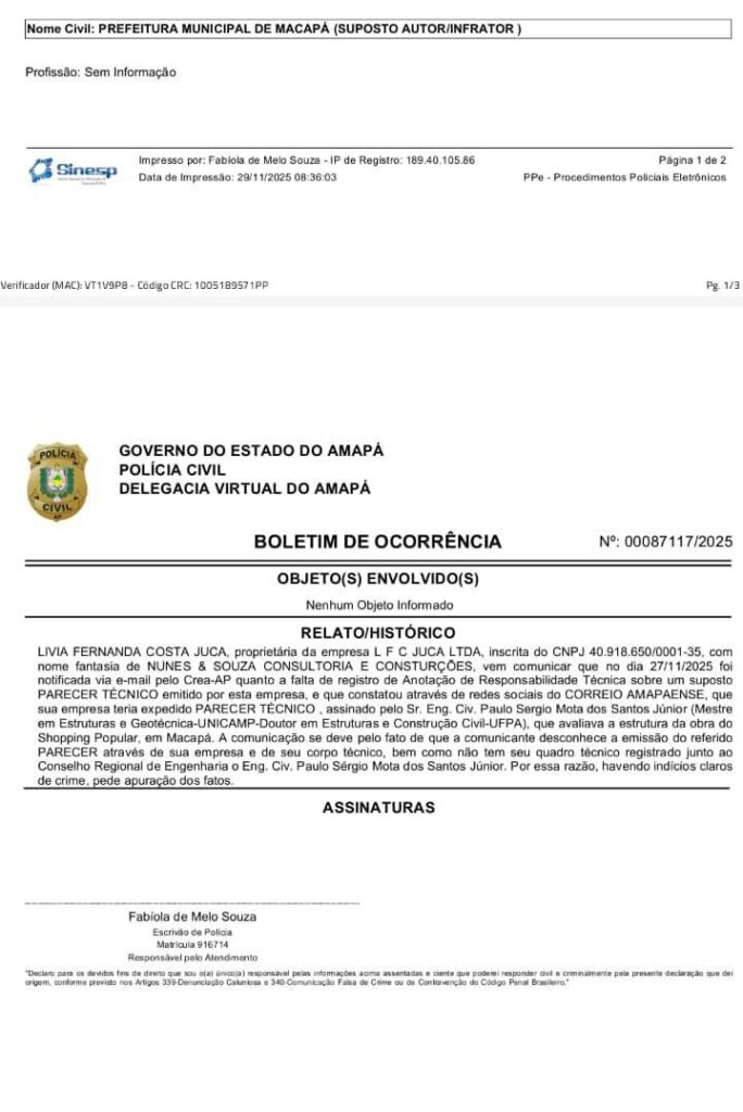 Na ação foi anexado ainda um boletim de ocorrência registrado por Livia Fernanda Costa Juca, proprietária da Nunes & Souza, dizendo desconhecer a emissão desse parecer feito pela sua empresa. Ela afirma que ficou sabendo do laudo ao ser notificada via email pelo Crea-AP sobre a falta de registro do ART. Lívia diz também que o engenheiro que assina o parecer não faz parte do quadro técnico da Nunes & Souza. Ela pede a investigação de crime de falsificação de documento público.