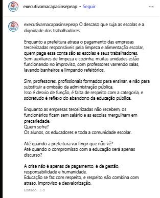 A nota viralizou entre educadores e servidores terceirizados, que relatam precarização das condições de trabalho e afirmam que vivem sob ameaças de demissão caso se manifestem publicamente sobre os atrasos.