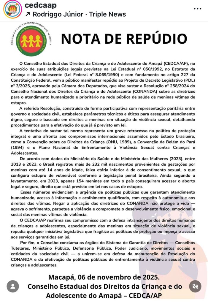 Em nota publica divulgada nesta sexta-feira (7) O Conselho Estadual dos Direitos da Criança e do Adolescente do Amapá (CEDCA/AP), manifestou repúdio ao Projeto, que, de acordo com o conselho visa sustar a Resolução nº 258/2024 do Conselho Nacional dos Direitos da Criança e do Adolescente (CONANDA) sobre as diretrizes para o atendimento humanizado e prioritário na rede pública de saúde de meninas vítimas de estupro.