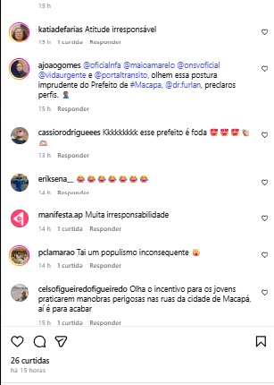 “Perigoso”, “irresponsável” e “péssimo exemplo” estão entre as expressões mais repetidas nos comentários. Para parte dos internautas, o episódio vai além da imprudência e se aproxima do que chamam de populismo em grau extremo, em uma tentativa de produzir cenas de forte apelo popular para manter visibilidade.